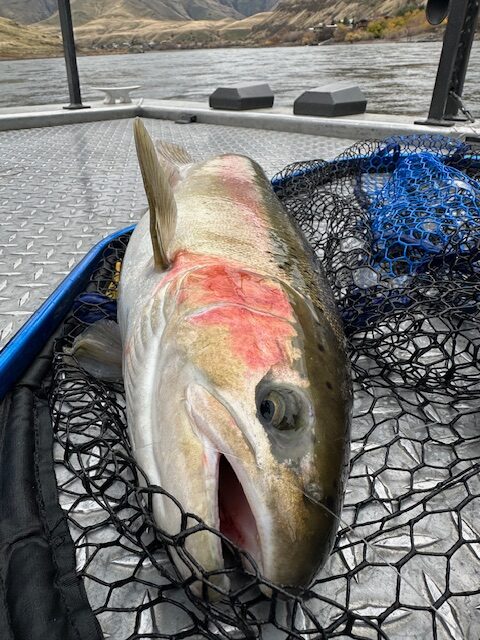 Today felt a lot like yesterday here in Hells Canyon—in the best way. We hit the water early with hot coffee in hand and started backtrolling for that first bite. It didn’t take long. One of the rods bent early, and up came a beautiful steelhead. With that high fin on her back, this big hen went right back into the river to do what she’s meant to do.