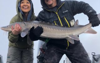 It was a day of sturgeon fishing this cold foggy day of November. Fishers Catch Outfitters set out for a day of fun sturgeon fishing on the Columbia river. It was a day of firsts for Anthony and Jackie. We managed to get them on 15 nice fighting fish with 3 nice over-sized and 3 in the keeper slot (retention season opens January 1st) Should be a good one. With this being the first day Jackie has ever fished in her life she did awesome and fished like a pro. Setting the hook on some nice fish and fighting them all the way to the Les Schwab sled. It was an awesome day on the water.