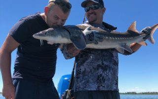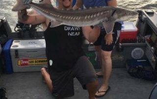 With a nice evening available and hanging out with the neighbors, we decided to hit the water for some fun Sturgeon action! My wife even decided to join in on the fun and landed her first Sturgeon ever. We had a couple first on this trip. It was a short evening trip but we were blessed with some great weather and five awesome fish! Fishers Catch Outfitters is not booking over-sized sturgeon trips. Give us a call! Bent Rods and Tight Lines my Friends!