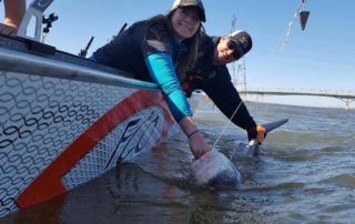 The water was completely open on the Columbia River with all shoots of the dam letting water go. The water was very rough and afternoon showers hit us a couple of times. However, the fishing really turned on with the Train Bite! We had several hits and one that smashed a bait with the rod doubling over and still missing the hook. However, Nicole got the next bite and set the hook on a keeper 49 Inch White Surgeon. She fought it like a pro and after 10 minutes of play she was able to bring the keeper fish to the side of the boat! Miles also landed a nice hard fighting little Sturgeon that we are excited to see grow up like his 12 foot cousins.